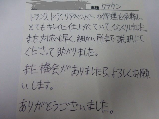 トランク、ドア、リヤバンパーの修理を依頼しとてもキレイに仕上がっていて、びっくりしました。また対応も早く、細かい所まで説明してくださって助かりました。また機会がありましたら よろしくお願いします。<<<<会社から一言 当社をご利用いただきありがとうございました。当社はヨーロッパ系の硬質クリヤーを使用していますので、光沢も良く、質感も自然な仕上がりが自慢です。長く乗られても きっとご満足いただけると、思います。