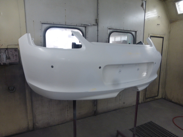 リヤバンパーの中央付近を柱の角にでもぶつけた様に凹んでいます。ナンバープレートも中央付近で折れています。ナンバー上部のふくらみのところも広範囲に歪みが見れます。このリヤバンパーを修理でご依頼いただきました。